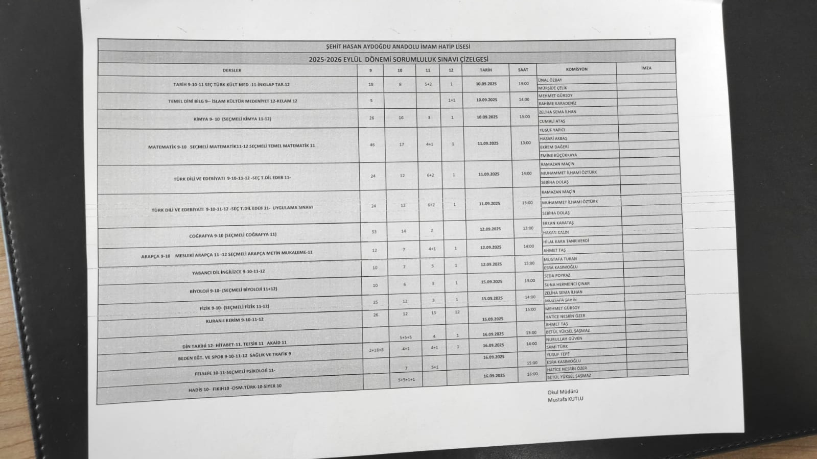 2025-2026 Eylül Dönemi Sorumluluk Sınavları Çizelgesi